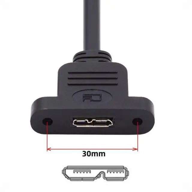 There is 2 screw holes at Micro USB 3.0 Female end. Cable length: approx. 50cm.