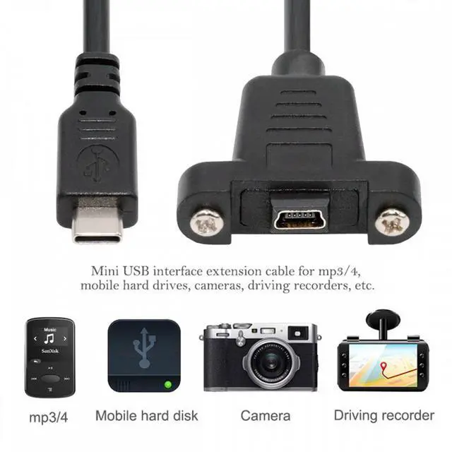 USB2.0 Mini 5Pin Female to Type-C USB-C Male Power Cable 480Mbps Data with Panel Mount Holes 30cm
