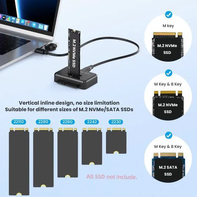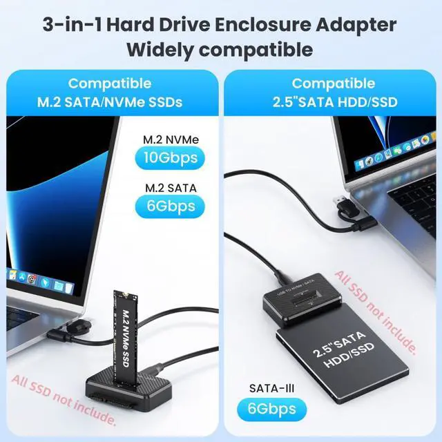 3) This USB3.0 to SATA SSD Enclosure work for 2.5inch Laptop SATA HDD SSD;Not work for 3.5inch Desktop SATA HDD SSD(5Gbps for SATA SSD); Note: NVMe and SATA SSD are not included.