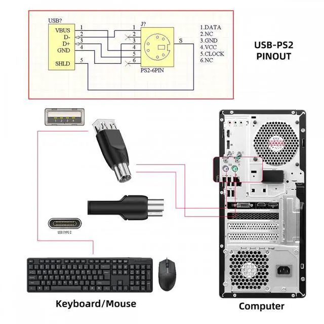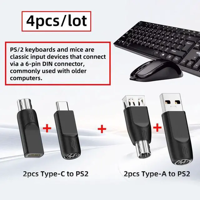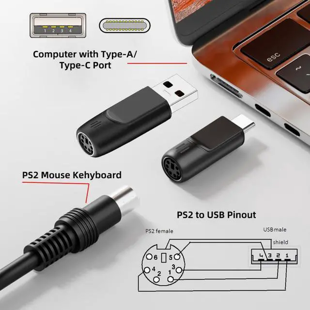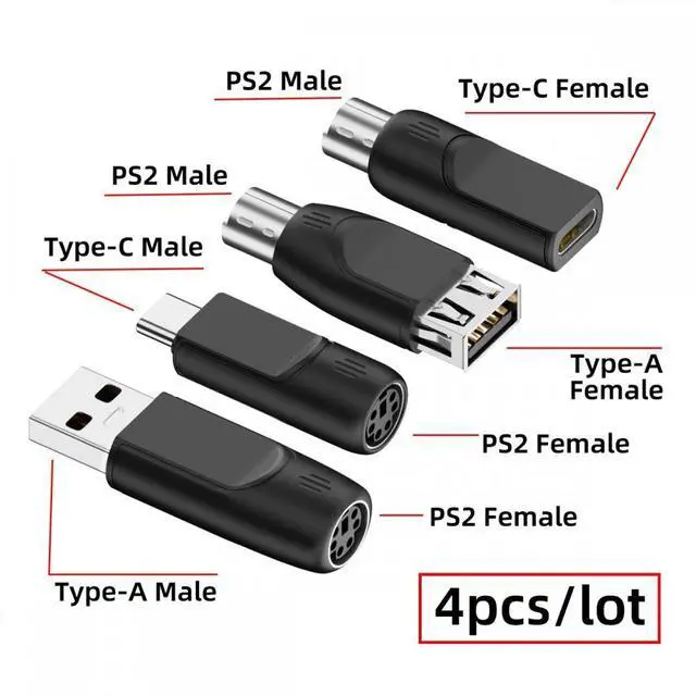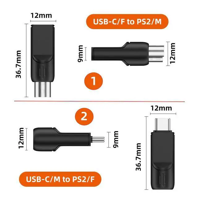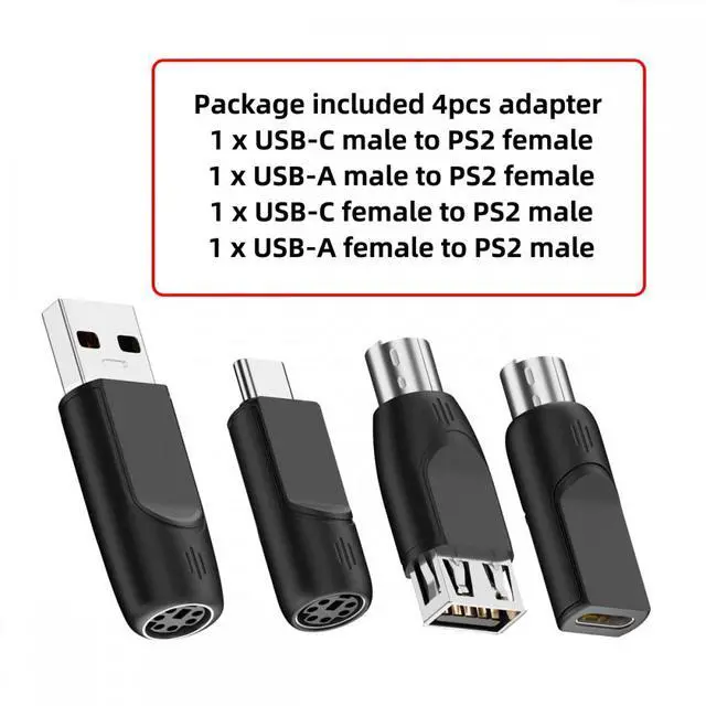 2pcs PS/2 male to USB-C/USB-A female adapters allow you to easily connect a USB mouse or keyboard to a computer with PS/2 ports. It's a practical solution when you need to free up a USB port or switch to a PS/2 connection for improved stability.