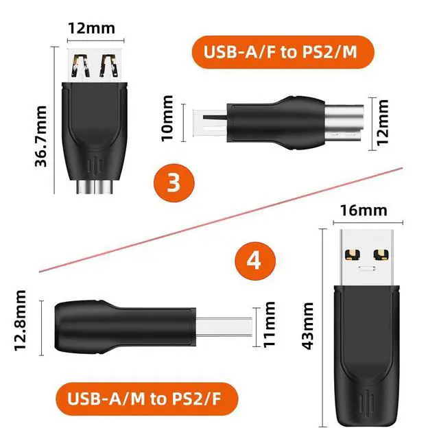 2pcs PS/2 female to USB-C/USB-A male adapters allow you to easily connect a PS2 mouse or keyboard to a computer with limited USB ports.