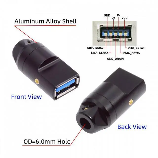 USB 3.0 Type-A Female Socket Receptacle Connector Solder Type with Aluminum Alloy Shell for 6.0mm Cable