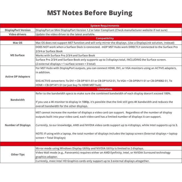 - The Microsoft Surface "Dock" is NOT compatible with Mini DisplayPort MST Hub and should not be used when the Surface Dock is connected.