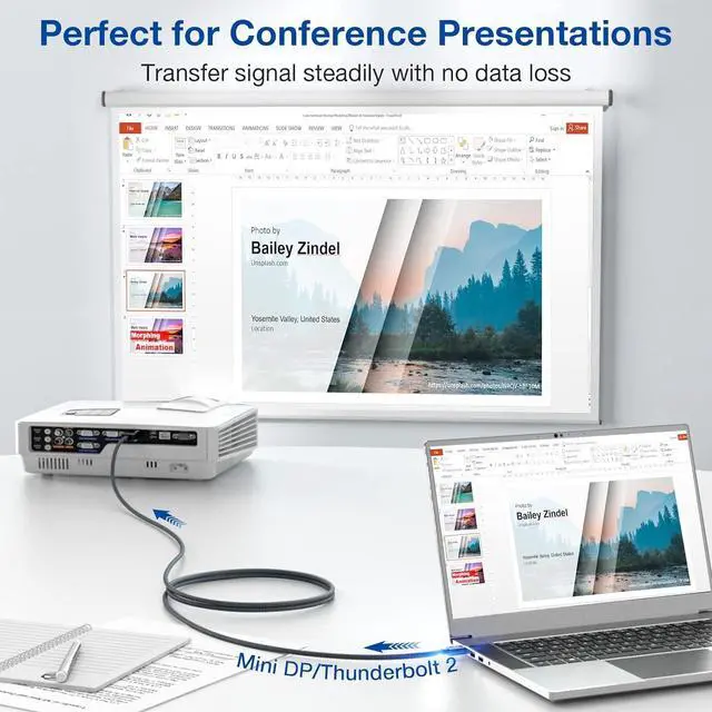Mini DP 1.4 to HDMI 2.1 Cable This Mini DisplayPort (thunderbolt 2) to HDMI cable allows you to connect laptops with Mini DP ports to external displays/TVs/Projectors with HDMI, which works beautifully whether you are planning to give presentations, or watch UHD videos with your laptop on a bigger screen. Note: It only transfers signal from mini DP to HDMI, NOT HDMI to mini DP.
