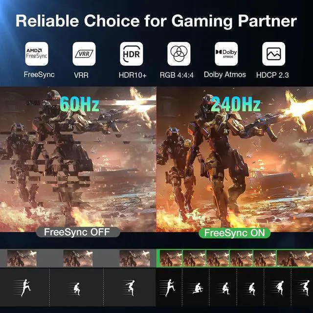 Functions Like No Other It almost follows the HDMI 2.1 standard. And compared with other Mini DP to HDMI, this is a whole new feature upgrade, not only can reach 8K@60Hz, but also support VRR, AMD FreeSync, Dynamic HDR, Dolby 7.1, 3D, BT.2020, 10bit color depth, DSC 1.2a for outstanding image and fast response in the gaming world.