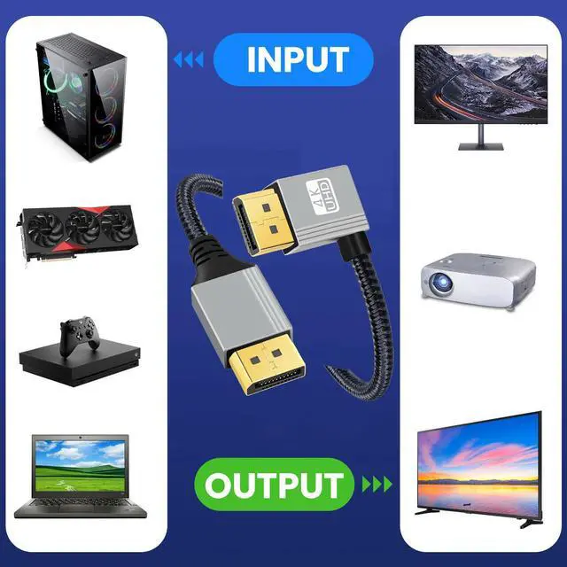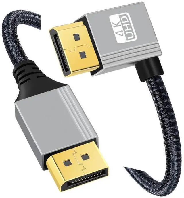RightAngled DisplayPort DP to DP Cable 4K 60hz Cable Silver Sleeve Ultra-HD UHD 90 Degree for Desktop Laptop Monitor Graphics CardSilver aluminum alloy shell, Light and easy to carry. With special tangle-free design woven braid sleeve jacket for long-term, rugged durability. The angled type Allowing you to connect it to a female port, even if space around the port is limited.