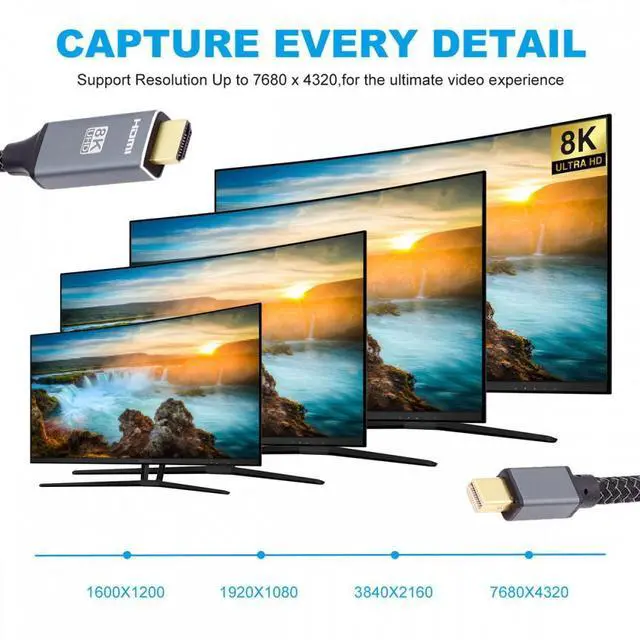 • MINI DP x HDMI cable supports 8K@60Hz, 4K@60Hz for MINI DisplayPort Enabled Desktops and Laptops to Connect to HDMI Displays, enjoy home theater with 8K/4K high resolution.