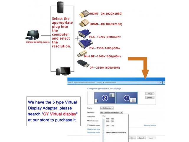 - We have the Virtual Display Adapter for hdmi, dvi, vga, displayport, mini-dp, please search "CY Virtual display" at our store to purchase it.