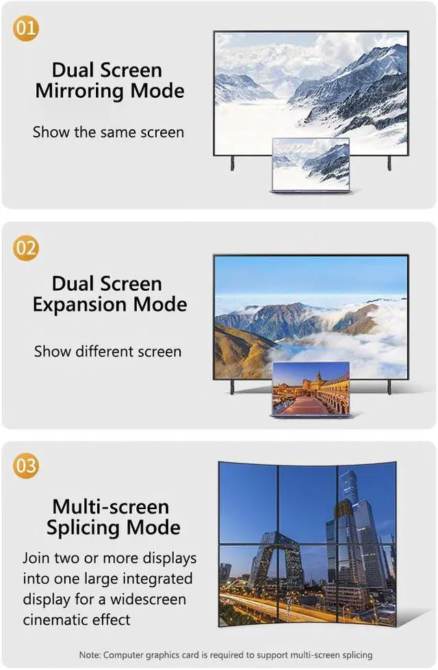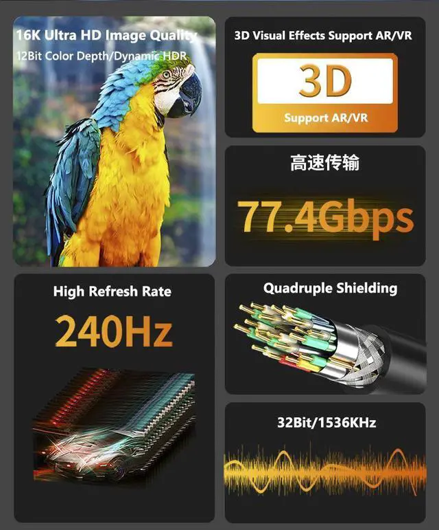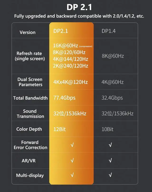• Refresh rate: 16K@60/30Hz, 8K@120/60Hz, 4K@240/144/120/60Hz, 2K@240/144/120/60Hz