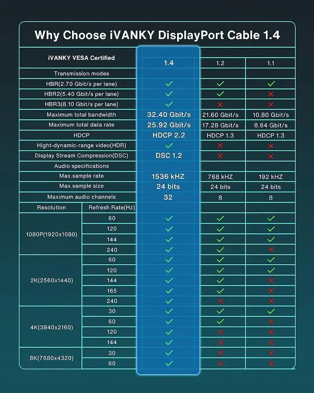 Our DisplayPort 1.4 cable is the latest technology with higher video resolutions, supports 8K at 60Hz,4K at 144Hz,2K at 165Hz and 1080P at 240Hz.
