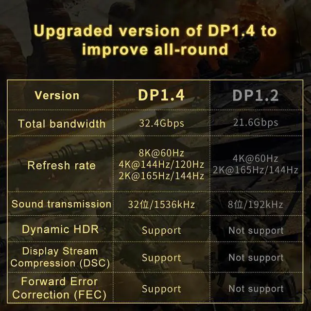 The Displayport 1.4 Fiber Optic Cable can provide higher bandwidth, HBR3 supports 32.4 Gbps of bandwidth, Display Stream Compression 1.2 (DSC). High refresh rate and high resolution, Maximize the performance of your graphics card and monitor, to allows you clearly perceive the movement of enemy, No motion blur, screen tearing or flickering. Dynamic HDR can optimize the game's dark picture and enhance the details, especially in FPS and 3A masterpieces.
