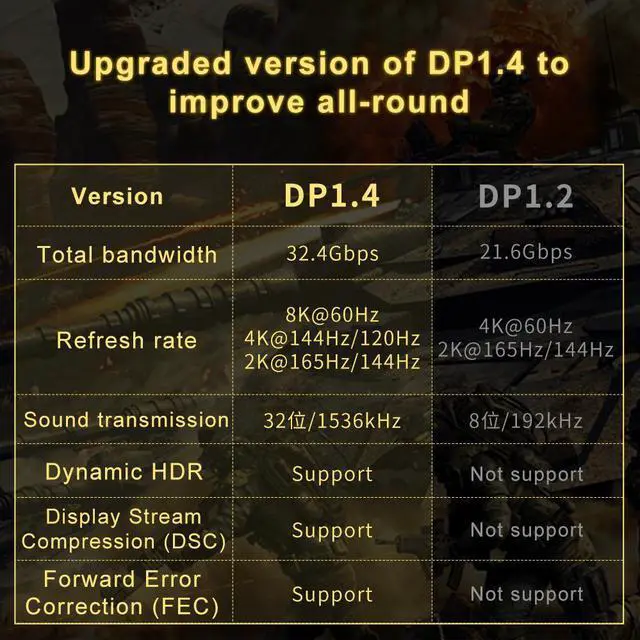 The Displayport 1.4 Fiber Optic Cable can provide higher bandwidth, HBR3 supports 32.4 Gbps of bandwidth, Display Stream Compression 1.2 (DSC). High refresh rate and high resolution, Maximize the performance of your graphics card and monitor, to allows you clearly perceive the movement of enemy, No motion blur, screen tearing or flickering. Dynamic HDR can optimize the game's dark picture and enhance the details, especially in FPS and 3A masterpieces.
