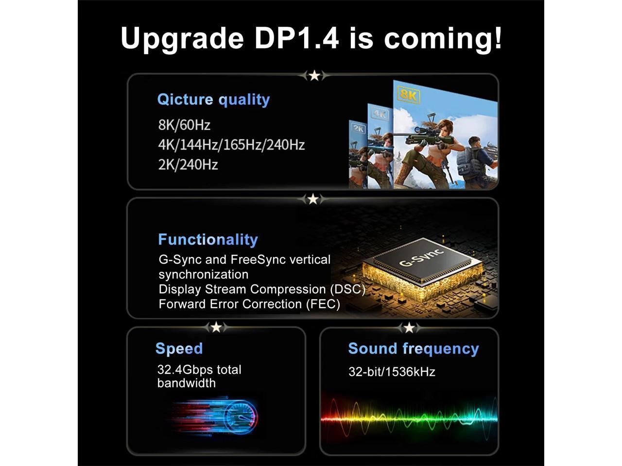- Resolution: 8K@60Hz, 5K@60Hz, 4K@144Hz, 4K@120Hz, 2K@240Hz