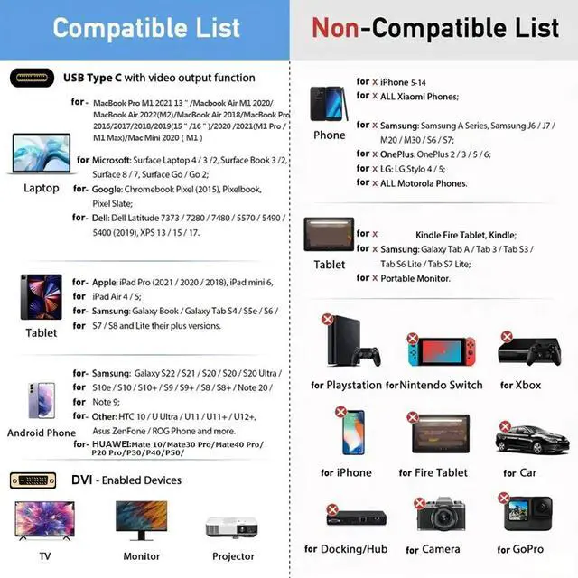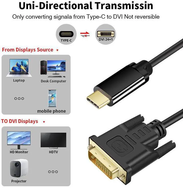 USB-C to DVI Cable provides a cost-effective and easy solution for connecting a desktop, laptop, or other devices with USB-C port to a DVI-D display such as monitor, projector or TV. Connect the USB-C male end to your laptop or computer's USB Type-C slot, and connect the DVI-D male end to your DVI-D display. Resolution Support video resolution up to 4K@30Hz, 1920 x 1080 @ 60Hz (1080p Full HD), including 720p and 1600x1200