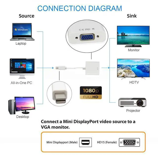 • Connectors: Mini DisplayPort Male to VGA Female