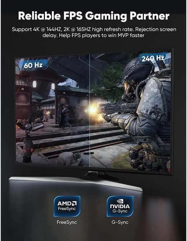 4:4: 4, HDR 240HZ for Smooth Gaming Experience Enjoy Gaming at a high refresh-rate of 4K@144Hz or 1080P@240HZ, makes it easier to track fast-paced action and that will put you ahead in FPS likes COD16, Battlefield or MOBA games likes LOL. FPS-Gamer Friendly Can handle all the data demands for both 4K and 8K content thanks to 32.4 Gbps bandwidth. Faster and more stable transmission signal Exclusive Top-notch Construction Unique latch-free design ensure that your graphics card or monitor port will not be damaged while ensuring a secure connection.