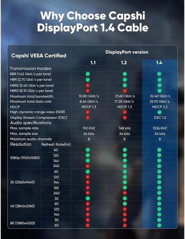 Refresh Rate: * 8K (7680 x 4320) @ 60Hz / 30Hz * 5K (5120 x 2880) @ 60Hz / 30Hz 4K (4096 x 2160) @ 144Hz / 120Hz/60Hz/30Hz 2K (2560 x 1440) @ 240Hz / 165Hz/144Hz/120Hz/60Hz/30Hz 1080p (1920 x 1080) @ 240Hz / 165Hz/144Hz/120Hz/60Hz/30Hz Ready for 8K With support for 8K@60Hz and 4K@120Hz, this is the only DisplayPort cable youll need for the next 10 years.