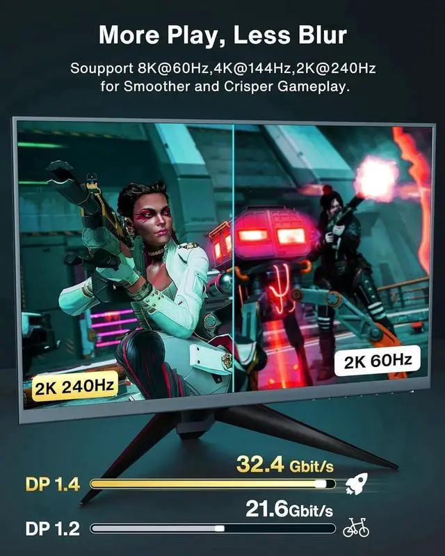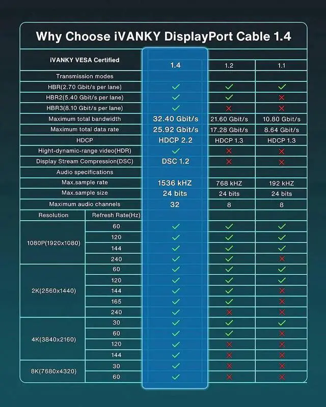 Our DisplayPort 1.4 cable is the latest technology with higher video resolutions, supports 8K at 60Hz,4K at 144Hz,2K at 165Hz and 1080P at 240Hz.