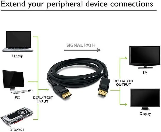 Connect a DisplayPort compatible PC to a monitor or projector with DisplayPort. Or, Connect a DisplayPort compatabile PC and laptop to a monitor with Displayport.