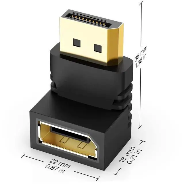 2-pack includes one 90 degree and one 270 degree male to female DisplayPort adapter with a short body, connecting devices for optimal settlement without bending the cable, especially in tight fit situations