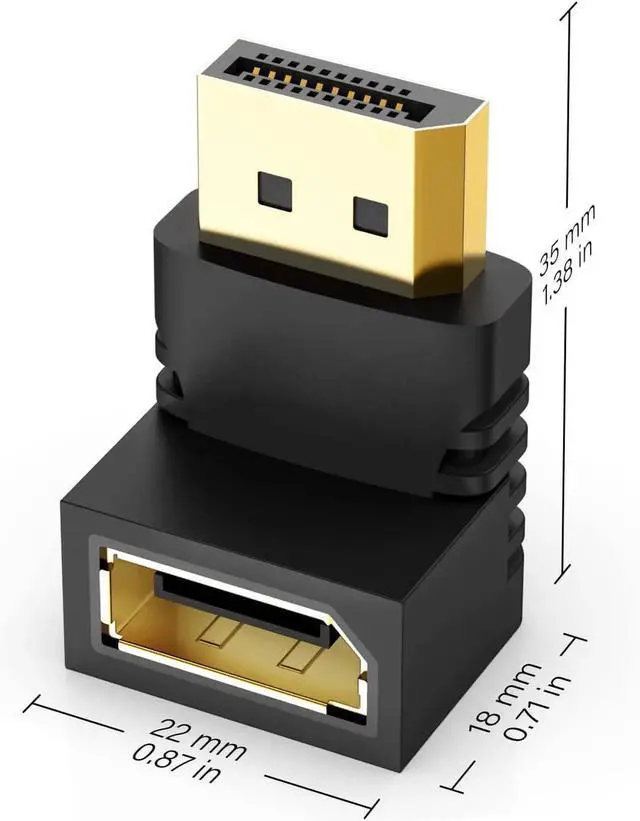 2-pack includes one 90 degree and one 270 degree male to female DisplayPort adapter with a short body, connecting devices for optimal settlement without bending the cable, especially in tight fit situations