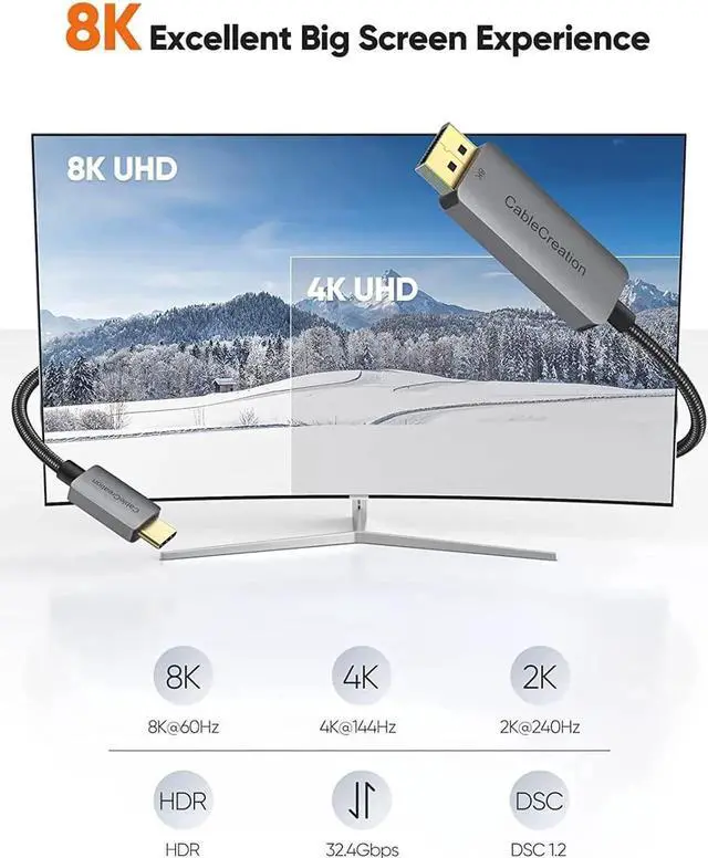 USBC to DisplayPort 1.4 - Max 32.4G bps bandwidth and 8K@60Hz high definition performance, downwards compatible 5K@60Hz, 4K@144Hz, 4K@120Hz, 4K@60Hz, 2K@240Hz. Enjoy more clear and more realistic image at larger screen. High refresh rate brings you smoother gaming experience, without flickering and no tear, no blur