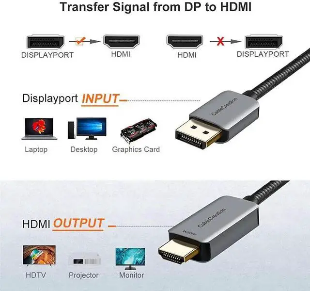 Specification: Ports: DisplayPort input; HDMI output Cable Length: 8FT / 2.5M Material: Gold-plated connector, aluminum case, braided jacket Color: Black Support max 4K@60Hz definition, HDR and HDCP2.2 & HDCP1.4 Support 6/8/10/12 bit color depth output Support output pixel format RGB4:4:4 / YCbCr4:4:4 / YCbCr4:2:2 CableCreation Braided DP to HDMI Cable Adapter The black 8ft Gold-Plated DP to HDMI cable connects DP-equipped computer / graphics card to a monitor, HDTV or projector with HDMI output. Support HDR and max 4K (4096x2160) @ 60Hz UHD resolution as well as bandwidths up to 18Gbps, which provide more detailed and realistic image, color, and depth. You could enjoy sharper images and enhanced video, with brighter colors and greater contrast. Downwards compatible with 3840 X 2160, 1080P, 720P and etc. Allow mirror and extend dual mode. Mirror mode: you could view your desktop / laptop screen image on an HDMI monitor, TV, projector; Extend mode: use one monitor to work and the other monitor to enjoy movie. With HDCP2.2 & HDCP1.4 support, you could play protected content from iTunes and Netflix. Important Tips: 1.Braided HDMI to DisplayPort 4K@60Hz UHD Cable 8ft supports High Dynamic Range (HDR), for output HDR quality video, both of your input (computer, graphics cards) and output (TV, monitor and projector) devices are required to support HDR. 2.If you want to reach 4K resolution, please make sure that both of your DP-equipped computer and HDMI monitor support 4K@60Hz. If the resolution of the computer is higher than the monitor, please lower the computer's resolution same as or lower the resolution of monitor.