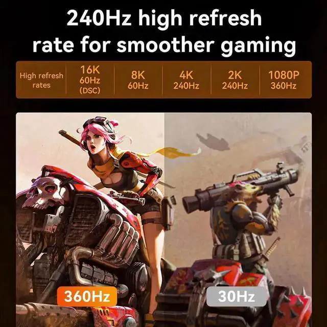 VESA Certified DP80 CableDisplay Port 2.1 Cable is the first VESA-certified DP80 cable With 80Gbps bandwidth, it supports uncompressed 4K@240Hz, 8K@60Hz and 2K@540Hz resolution. Up to 16K@60Hz, 8K@240Hz, 4K@960Hz 540Hz 480Hz 360Hz with DSC enabled.