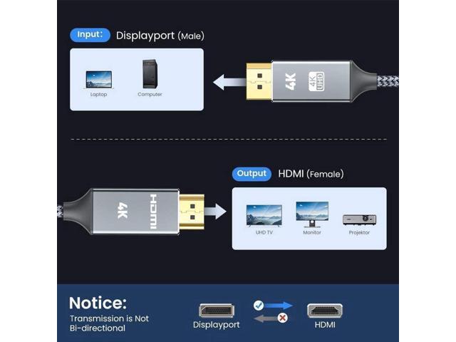 - [Uni-Directional] It is a UNI-DIRECTIONAL cable, ONLY works to convert from DisplayPort source to HDMI display. This DisplayPort to HDMI Cable is compatible with laptop, desktop tower, graphic card (AMD, NVIDIA), TV, Monitor, Projector and other devices.