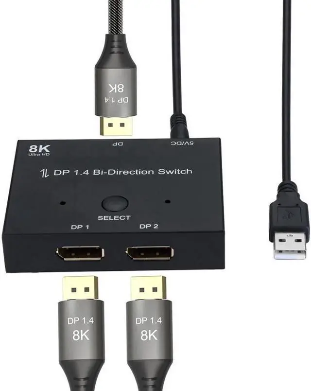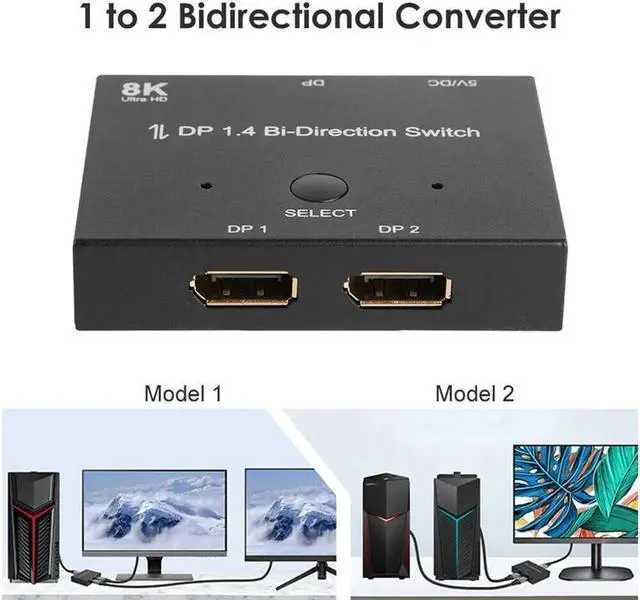 Splitter: Support 8K@30Hz, 4K@120Hz, 1080P@240Hz resolution, provide you with transfer rates up to 32.4G bps and backward compatible with all previous DP standards. (You need connect standard DP 1.4 cable to enjoy visual effects. ) The DisplayPort switcher allow you to connect two DP source to one DP display or connect one DisplayPort source to toggle between two displays. Two Modes Mode one (Splitter) One PC connects two displays