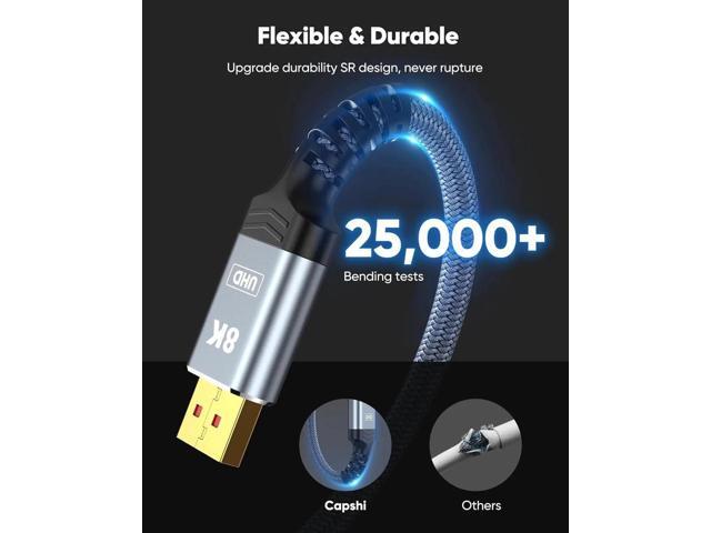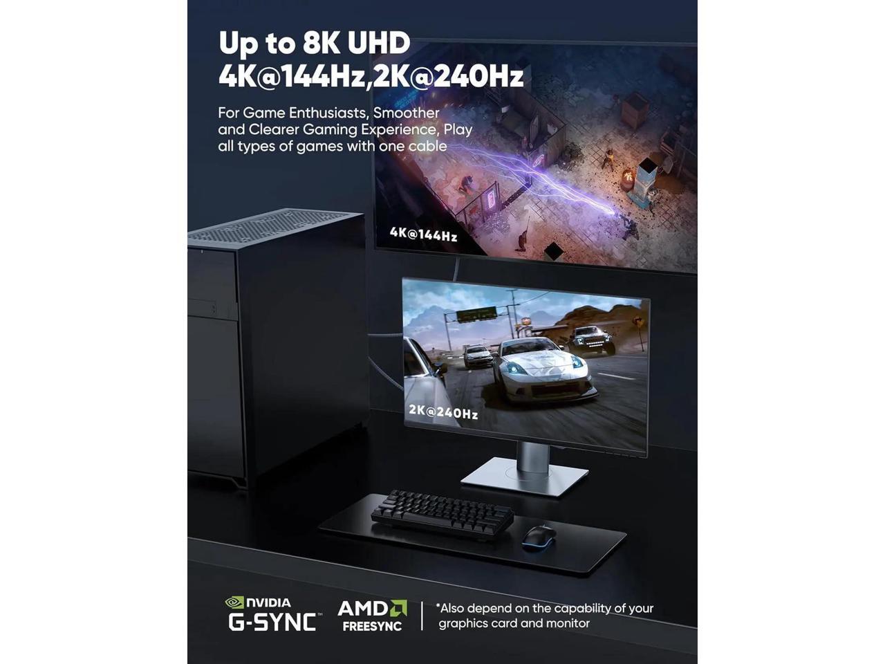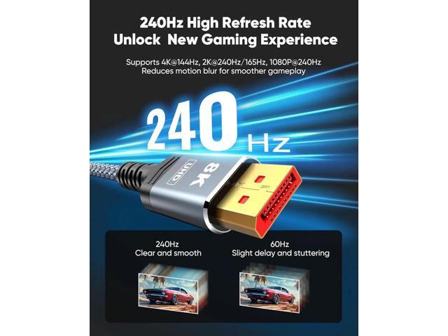 - Supports video resolutions up to UHD 8K (7680×4320)@60Hz and offers a refresh rate of up to 240Hz under 2K (2560*1440) resolution, and flawless audio pass-thru for uncompressed digital 7.1, 5.1 or 2 channels. The DisplayPort to DisplayPort cable also supports DP, DP++, and DisplayPort++.