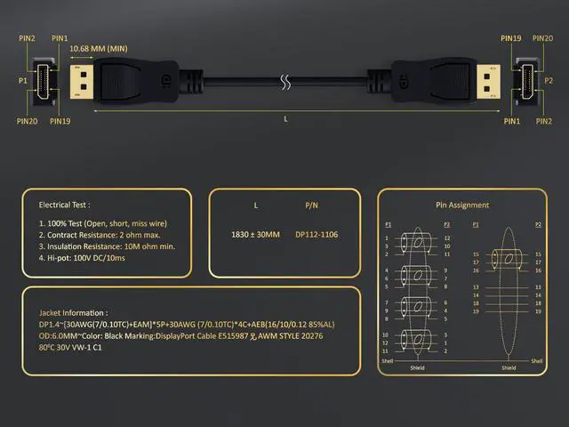 DisplayPort 1.4 standard, as defined by the Video Electronics Standards Association (VESA) since 2006. Our cables offer uncompromising compatibility with the DisplayPort 1.4 specification, delivering breathtaking resolutions up to 8K@60Hz UHD (7680 x 4320) and 4K@120Hz.