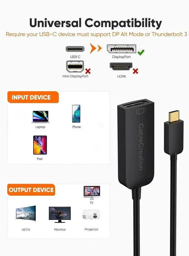 • Wide Compatibility: This USB C to DP Adapter is compatible with MacBook Pro/ MacBook Air 2020 2019 2018, iMac (Mid 2017) and newer, Mac Mini 2018, iPad Pro M1 2021/ 2020/ 2018, XPS 15/ 13/ 12, EliteBook Folio G1/ Spectre 13, Thinkpad E580/ T470/ T480/ X1 Carbon 2017, Pixel (2015)/ Pixelbook, Surface Book 2/ Surface Go/ Surface Pro 7, Galaxy Tab S4/ S5e/ S6, Galaxy S22/S22 Ultra/S20/ S20+/ S20 Ultra/ S8/S9/S10/Note 9/Note 8
