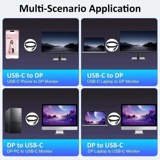 Broadly Compatibility: dp to usb c connects USB-C laptops like MacBook Pro, Dell XPS and HP EliteBook to DisplayPort 2.0 monitors, please check your laptop supports video output (DP Alt Mode) or not and to reach 16K please ensures both computer and monitor specs are support the desired resolution (16K@60Hz or 8K@120Hz).