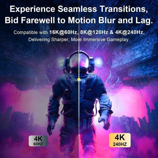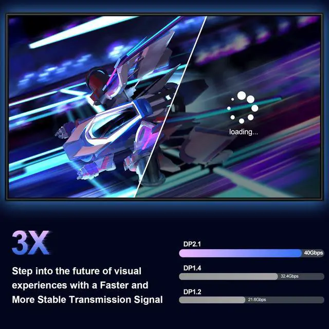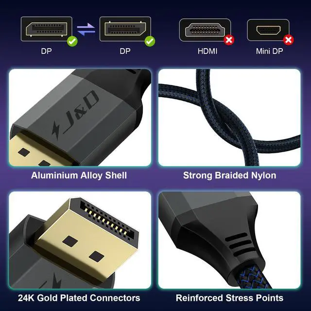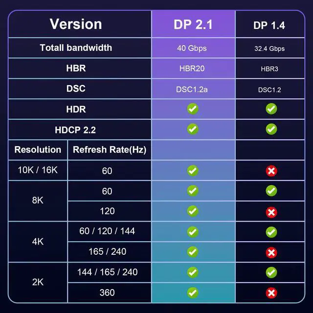 16K DisplayPort: with 16K@60Hz Ultra HD resolution, it delivers detailed image quality and meets a lot of frame rates, including 8K@120Hz, 4K@240Hz/165Hz/144Hz, and 2K@360Hz with up to 80Gbps bandwidth, certified by the VESA Association, it supports Dynamic HDR, HDCP 2.2 and DSC1.2a, and is fully backward compatible with DisplayPort 2.0, 1.4, 1.3, 1.2, 1.2a, 1.1, and 1.0, making it easy to connect to both old and new devices