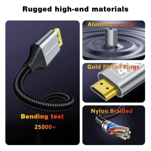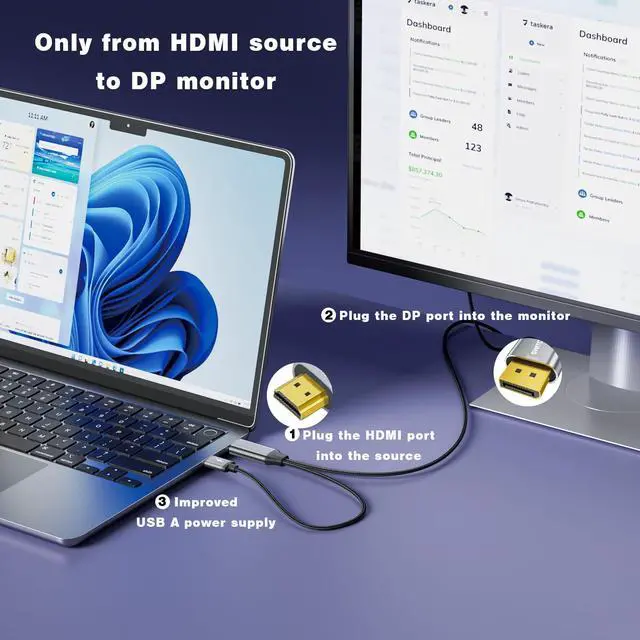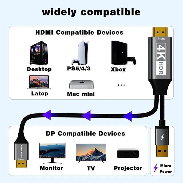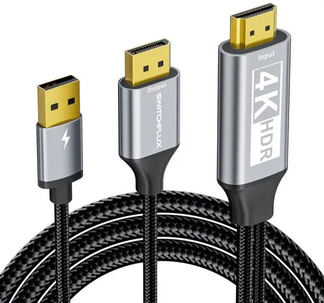Plug and Play,Convenient and EfficientThe HDMI to DisplayPort 6FT cable requires no additional drivers or software to install,it can be plugged in and used directly,easily and quickly transmitting audio and video signals from the HDMI source device to the DisplayPort display device at high speed.If it doesn't work after connecting,plug it into USB-A power supply to work normally