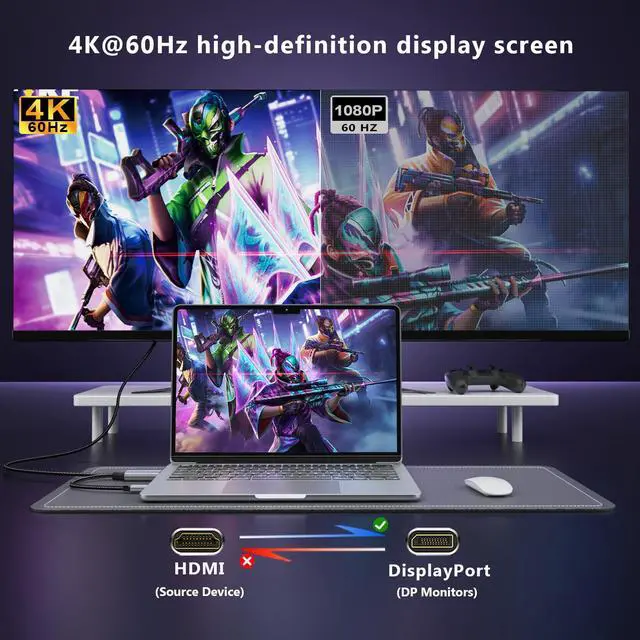 Excellent Performance,High Definition PresentationHDMI to DisplayPort Cable is built-in advanced IC chip,supports DisplayPort 1.2a,HDCP 1.3/1.4/2.2, HDMI 2.0 and other specifications,supports up to 4K@60Hz resolution,and is backward compatible with 2K@60Hz, 1080P@120Hz and other resolutions.Meanwhile,it supports 7.1,5.1 or 2-channel uncompressed digital audio,bringing users a clear picture and high-quality sound experience