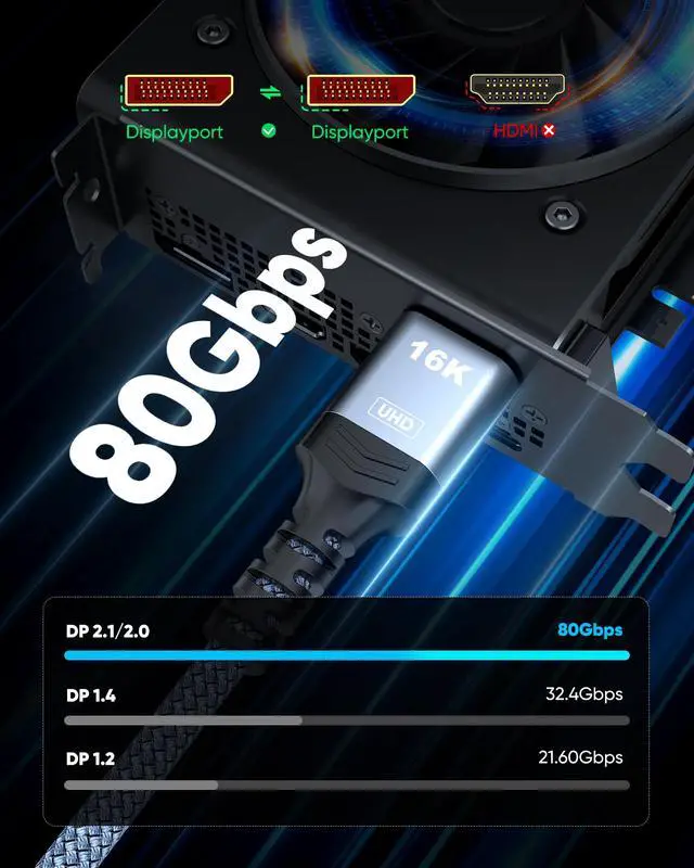 Unmatched Resolution & Bandwidth: 16K displayport cable experience the cutting edge with support for stunning 16K@60Hz (DSC), 10K@60Hz, 8K@120Hz, 4K@240Hz/165Hz/144Hz, and 2K@240Hz/165Hz/120Hz. Delivers ultra-high bandwidth (80Gbps) for pristine image quality and lossless multi-channel audio output
