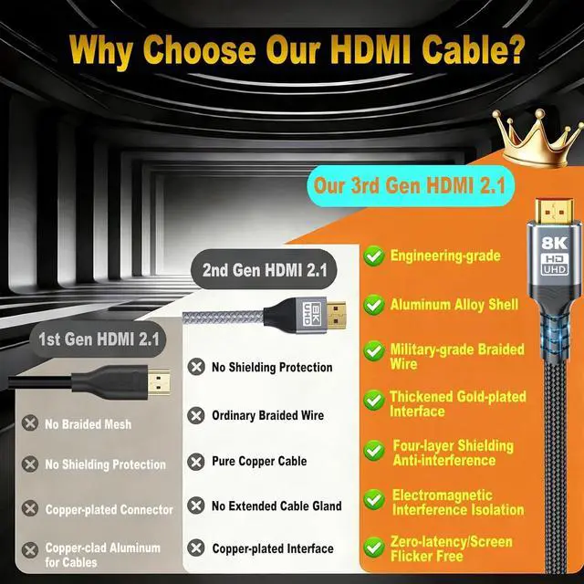 HDMI Cable ]: This 8K HDMI cable uses the most cutting-edge technology to accurately process every signal particle and clearly display every signal source transfer at lightning speed. It can achieve a resolution of 7680x4320 supports high frequency 8K@60Hz 4K@120Hz 8K unique and upgraded HDR EARC VRR and 12-bit color processing technology and has a higher level of improvement in audio and color video Scenes 3D scenes are more realistic!?? [ High-end material-High quality