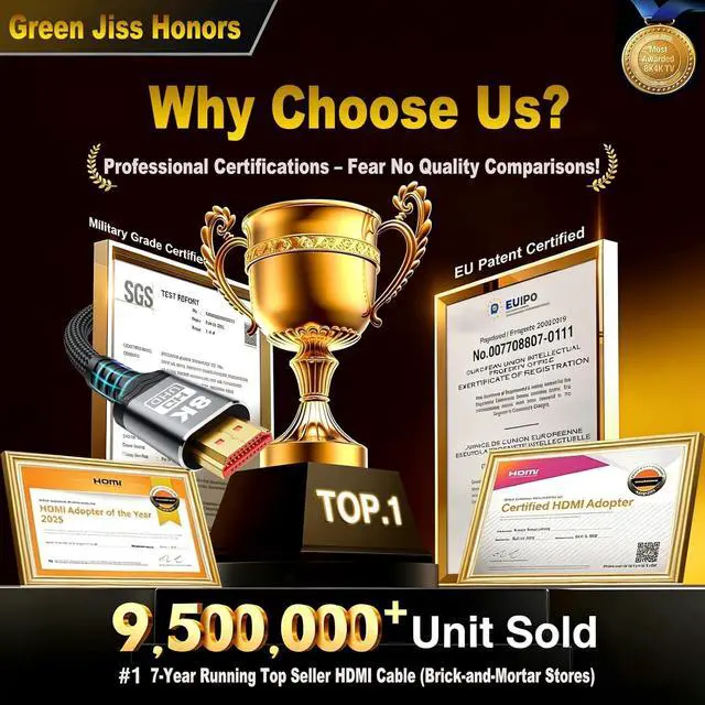 Compatibility ]: Compatible with all of your HDMI devices. Blu-ray players Fire TV TV PS5 PS4 XBox One Nintendo Switch computer laptop monitor projector and more. make the game smoother no tearing no stuttering no dislocation Indispensable hdmi cables for home and office equipment.?? [Strict Quality Control] Green Jiss HDMI 8K cables are manufactured with strict quality control standards. Every cable and even every part has been put through rigorous testing. We've combined every flawless part into a perfect 8K HDMI cable. Then pass the performance tests in the laboratory and present them to you after passing the exam.