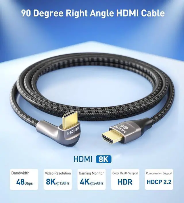 Unleash the full potential of 8K with the Cable Matters 8K HDMI Cable; Cable supports high bandwidth HDR with a 48 Gbps bandwidth as specified in HDMI 2.1 standard with more than 2x bandwidth compared to HDMI 2.0 HDMI 2.0 b and 4K HDMI cablesRight-angle connector of the HDMI cable 8K is the perfect fit for wall-mounted television or devices in entertainment centers; Right angle HDMI cable reduces the stress placed on the HDMI connector; Braided 8K HDMI cable features a braided cable jacket for tangle and fray protection and premium metal connectors and gold-plated contacts provide unmatched durabilityHigh speed HDMI video resolution support up to 8K (7680x4320) including HDMI 2.0 a cable 4K Ultra HD HDR resolutions with the 8K HDMI to HDMI cable; Hear immersive audio for surround sound 7.1 and 5.1 channels including Dolby Atmos and DTS X with this feature filled HDMI monitor cableGaming 8K HDMI cable supports popular devices such as the PS4 Pro Xbox One and TV 4K with advanced features; 8K HDMI cable is the perfect companion for the Xbox Series X 8K and PlayStation 5 8K; 8K gaming cable supports 8K video on the Nvidia RTX 3090 and Nvidia RTX 3080 graphics cardsConnect with confidence with this HDMI cable with full HDMI feature support for the latest video audio and gaming features on your TV or monitor; Enjoy 4K streaming video with this Dolby Vision 4K HDMI cable; HDMI 4K 60Hz cable is backward compatible with HDMI 2.0 cable and supports 4:4: 4 RGB HDR 12-bit color and Dolby Vision; Fully compatible with HDMI ARC (Audio Return Channel) features for immersive audio even through an A/V Receiver