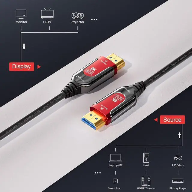 HDMI 2.1 Cable: HDMI 2.1 cables are made of optical fiber material antiinterference and durable. supports 8K@60Hz 4K@120Hz UHD display and 48Gbps bandwidth. Plenum Rated HDMI CableThe 8K Fiber Optic HDMI Cable with durable PVC jacket and strain relief CMP fire rated cable for walls floor ceilings ducts conduits. Ideal for commercial environments and home office.
