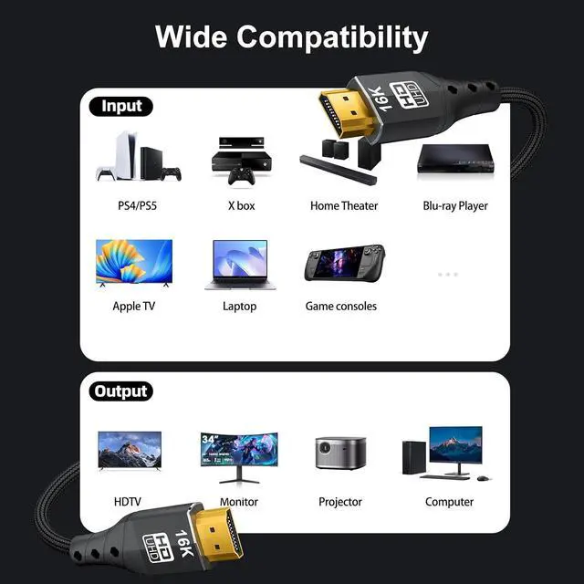 Wide compatibility: 8K/16K UHD TVs (e. g. LG flagship models) Professional gaming monitors Next-gen game consoles (PS5 Xbox Series X|S) High-end graphics cards (NVIDIA RTX 4090 AMD Radeon RX 7900 XTX) Professional film post-production workstations/design hosts 8K Blu-ray players and Dolby Atmos AV receivers Mainstream game consoles (PS4 Pro Xbox One X) Laptops/desktops Blu-ray players TV boxes Projectors Soundbars Monitor and more