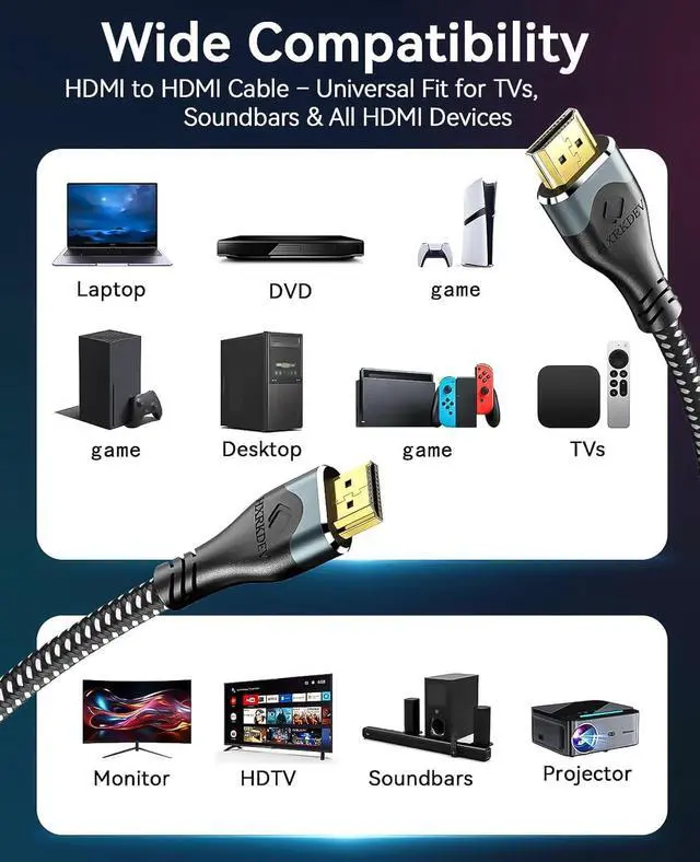 4K HDMI 2.0 Cable Certified 4K Ultra High Speed HDMI 2.0 Cable uses the most cutting-edge technology is compatible with 4K@60HZ 2K The 18Gbps bandwidth ensures smooth transmission eliminating lag and signal lossCrystal-Clear Visuals Elevate your home entertainment with our 4K HDMI cable. Supporting 18Gbps High Speed indulge in seamless transitions between 4K@60Hz resolutions for crystal-clear visuals. Experience the vibrancy of Dynamic HDR immersive 3D visuals and HDCP 2.0 compliance for an unparalleled viewing experienceDurable Design Features 24K gold-plated connectors and durable nylon-braided jacket can ensure that this 4k hdmi cord withstand up to 10 000 flex times and accurately transmits signals greatly extending use lifeGaming Excellence Our enhanced 4K long HDMI cable amplifies gaming experiences.