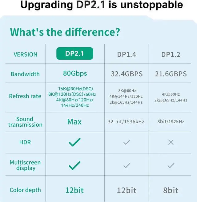 HIGH SPEED DISPLAYPORT 2.1 CABLE : HIGH END RESOLUTIONS 16K Displayport 2.1 feature provide 80Gbps bandwidth. Stable and High-speed transmission without signal loss. Meets the VESA Standard and supports Dynamic HDR 4:4:4 / HDR 10 and HDCP 2.2. Plug and play. Works with DP, DP++, and DisplayPort++.