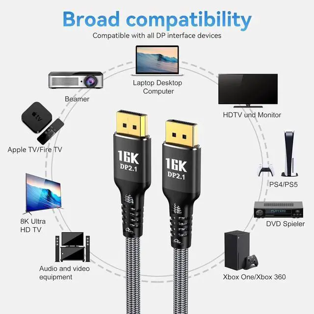 - Upgraded Nylon Braided: With double nylon braided design, these 16K DP cables are more stable, more durable than PVC, withstand 15000+ bend tests.Display port cable adopts an upgraded version wire, which is softer and has strong anti-interference ability