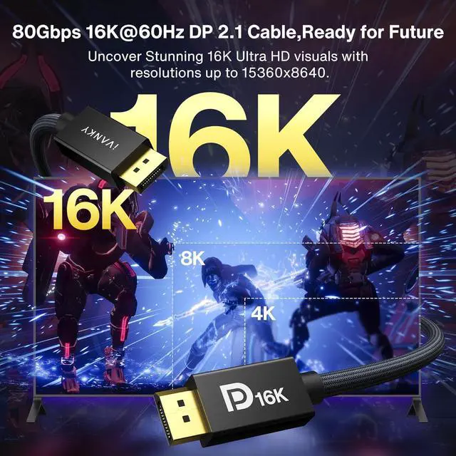 Important: Only for DP to DP connections NOT HDMI or Mini DP[Optimal Choice for Gaming Enthusiasts] The 16K display port 2.1 cable features an unprecedented bandwidth much faster than the prior DP 1.4 spec; This ensures stable high-speed data transmission without signal loss; It supports gaming essentials such as FreeSync and G-Sync; Immerse yourself in thrilling multi-screen gaming with MTS while Variable Refresh Rate (VRR) and Auto Low Latency Mode (ALLM) make your gaming smoother than ever especially in FPS 3A and MOBA games[Lifelike Visuals] Our displayport to displayport cable 2.1 goes beyond the ordinary supporting 3D HDR HBR20 HDCP 2.2 DSC 1.2 a and FEC for an unmatched immersive experience; HDR in particular elevates your viewing with its breathtakingly rich colors and sharp contrasts; Don't miss a sound with 32-bit audio and Dolby&eARC capturing even the faintest enemy footsteps and breathing[Durable and Interference-Free] Our displayport 2.1 cable is meticulously crafted with 30AWG tinned copper and triple shielding promises stable signal transmission and a more flexible slimmer wire than 28AWG tinned copper; The Alumalloy housing not only resists rust but also facilitates stable heat dissipation; In terms of longevity the double Nylon Braided jacket outperforms traditional PVC by a factor of ten; Latch-free design prevents accidental damage to the device when unplugging[Wide Compatibility] The DP cable 2.1 is highly recommended for game setups as it works well with game monitors and graphics cards delivering high-quality video and audio signals; Seamlessly connect your DP-enabled devices to monitors including Odyssey G8 G9 CRG Ben Q Alienware LG monitors HDTV Fire TV and more; Also it's compatible with popular graphics cards like NVIDIA RTX 5090/4090/3090/3080 AMD 7900/6900/6800 and supports DP DP++ DisplayPort++ G-Sync Free-Sync[iVANKY's Customer Support] You'll receive 1 pack 16K DP 2.1 Cable 6ft along with our friendly support team ready to help within 24 hours; Each iVANKY cable undergoes meticulous testing to ensure it meets the highest quality standards; We also provide expert technical support to all our customers; Additionally you can enjoy conditional customer support for up to 54 months[Premium Braided DP Cable] Our DisplayPort Cable is designed for customers who need an additional or replacement DP video cable; Unlike the standard cables that come with most monitors this cable features a durable braided design offering added strength and longevity; Please verify that the 6.6 feet length fits your space before purchasing; measuring in advance is recommended to ensure an ideal fit