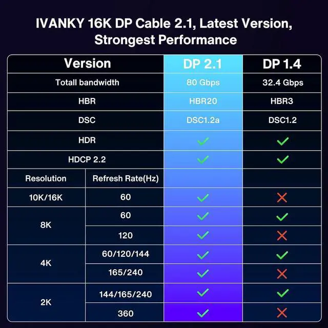[80Gbps DisplayPort Cable 2.1 ] iVANKY 16K DP to DP 2.1 cable delivers ultra-high bandwidth of up to 80Gbps; The DP 2.1 Cable supports high resolutions like 16K (15360*8640) @60Hz 10K@60Hz backward compatible with 8K@120Hz 4K@240Hz and 2K@360Hz and more; This is the only Display Port cable you'll need for the next decade; It's also backward compatible with DisplayPort 2.0 1.4 1.3 and 1.2;