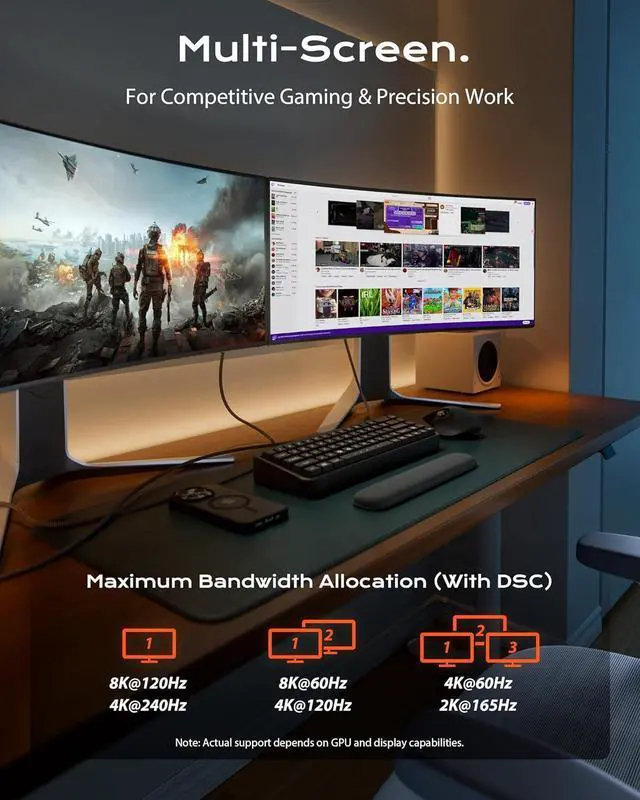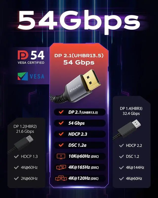 [Official VESA Certified UHBR 13.5 ] This cable is Official VESA Certified to ensure a verified 54Gbps bandwidth significantly outperforming standard DP 1.4 cables. It is specifically optimized for RX 7000 RTX 50 Series and next-gen 8K monitors. Validated through rigorous lab testing it delivers uncompressed visual fidelity and stable high-refresh rates (4K@240Hz / 2K@360Hz) without the signal drops or handshake issues found in non-certified alternatives[Triple-Layer Shielding & 28AWG Core] Built for interference-free stability. We use a thick 28AWG Oxygen-Free Copper core wrapped in triple-layer shielding (Nylon Braid + Aluminum Foil + Metal Braiding). Heavy-duty construction is 10x more abrasion-resistant than cheap PVC cables and completely isolates the signal from power cord EMI/RFI interference.