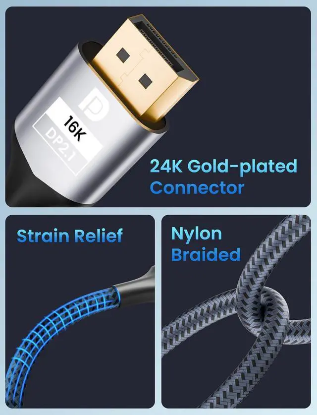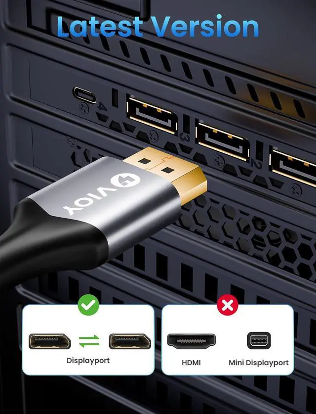 Adaptive-Sync technologiesProfessional: VIOY DP cable 2.1 meets DisplayPort 2.1 specifications delivering 80Gbps bandwidth. Supports high resolutions including 16K@60Hz with DSC 8K@120Hz 4K@240Hz and 2K@360Hz; Supports Dynamic HDR HDCP 2.2 and DSC 1.2 a technology while being backward compatible with DisplayPort 2.0 1.4 1.3 1.2 1.2 a 1.1 and 1.0 versions; Support lossless audio transmission for 7.1 5.1 and 2.0 channels while being compatible with 3D imaging technologyDurable